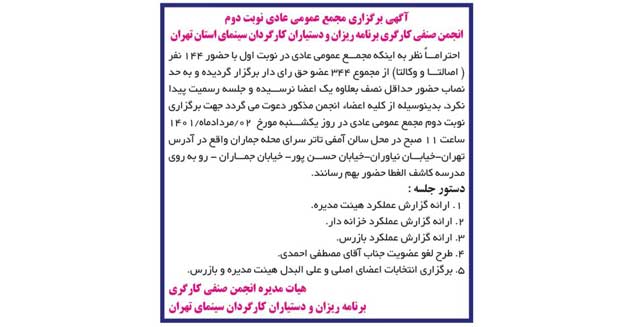 بدين وسيله خدمت شما عزيزان اعلام مى كنيم به يارى خدا نوبت دوم مجمع عمومى عادى انجمن ما جهت انتخابات هيات مديره و بازرس در تاريخ  يكشنبه ٢ مردادماه ١٤٠١ رأس ساعت ١١ در سالن آمفى تئاتر سراى محله جماران واقع در آدرس تهران، نياوران، خيابان حسن پور، خيابان جماران روبروى مدرسه كاشف الغطا برگزار خواهد شد.